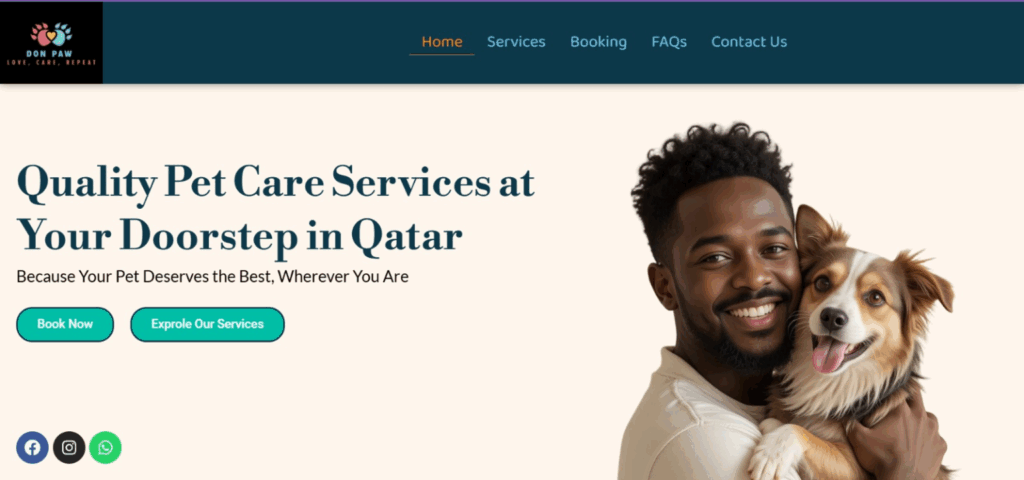 A website designed for a pet care business offering door-to-door services in Qatar
