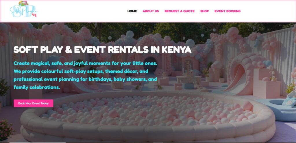 A vibrant kids’ event rental website offering soft play, ball pits, bounce houses, and fun setups.