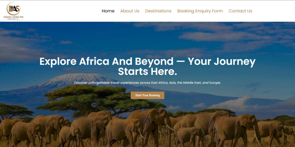 Clean, professional safari-focused site promising tailored African and global travel adventures — simple booking process.
